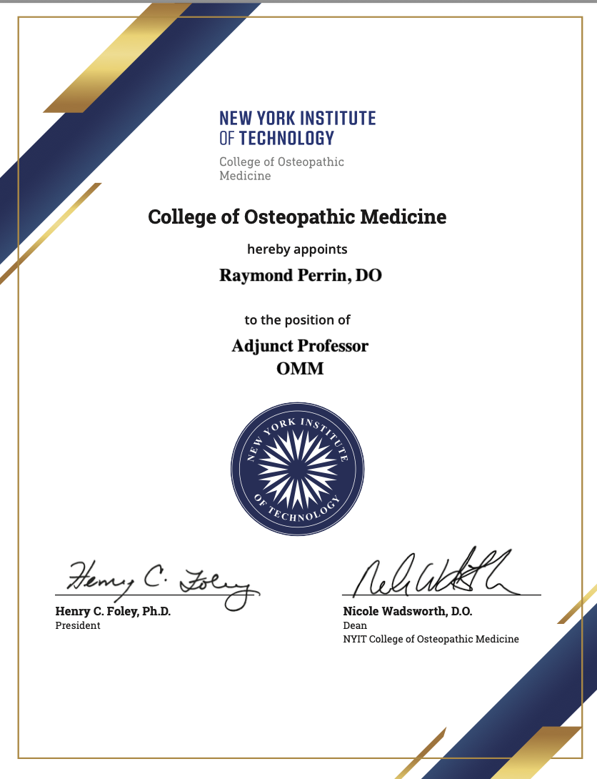 We are delighted to announce that Dr Raymond Perrin has recently been appointed as Adjunct Professor in Osteopathic Manipulative Medicine at the New York Institute of Technology College of Osteopathic Medicine (NYITCOM).